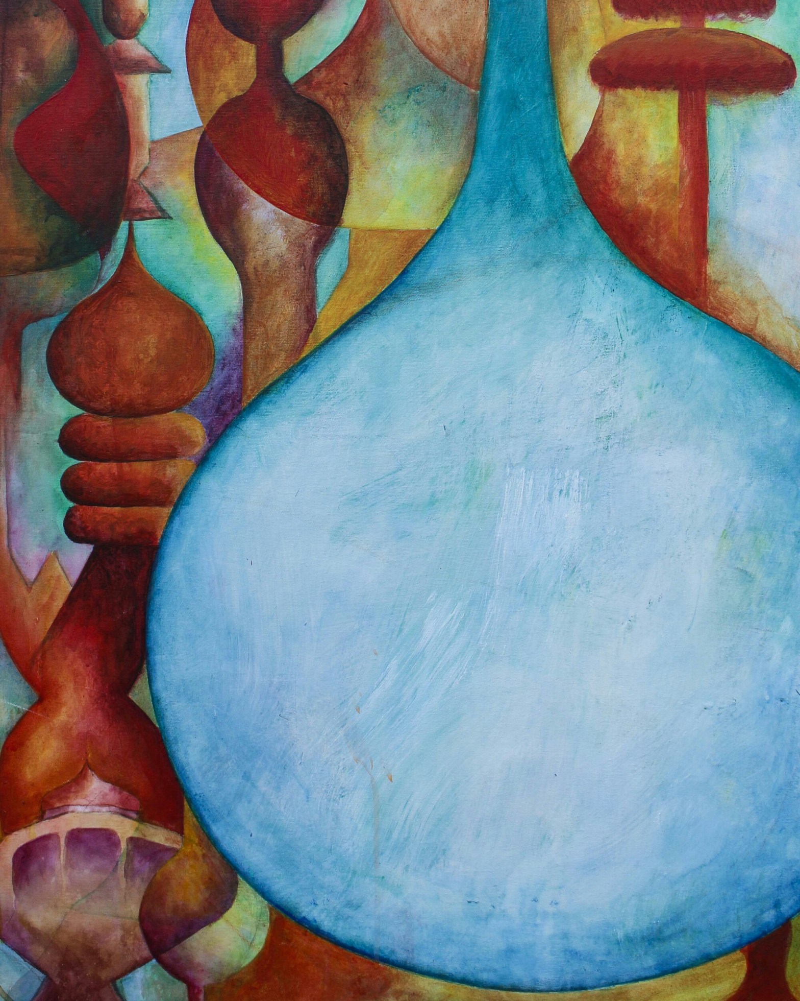 I created this acrylic painting while living in Doha, Qatar (2006). I felt inspired to paint the charming minarets, mosques and vibrancy of life in the traditional Souqs. This powerful image of the overshadowing blue ornament came to me in a dream, when I woke, I couldn’t wait to paint what I had visualised that night. Recently, I’ve come to believe it may be a subconscious symbol of a water droplet as the heat was phenomenal in Qatar. What do you think? Doha is a captivating, beautiful city, I hope I’ve captured this in some of my cubist paintings that can be found here.